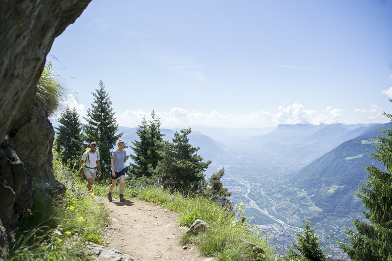 Es sind vielfältige landschaftliche Gegebenheiten und das milde Klima, die das Meraner Land zu einer der begehrtesten Wanderregionen auf der Südseite der Alpen machen. Unten im Tal Apfelwiesen und Kastanienhaine, weiter oben sonnige Hänge und sanft gewellte Almen und ganz oben oft im Frühjahr noch schneebedeckte Felsgipfel, die konditionsstarken Wanderern vorbehalten sind.